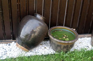 メダカ鉢はここ以外にも何カ所かおいています。ほかのところでも目立たないけれど被害に遭っています。庭の塀際においている鉢には、隣の結構重い徳利型の鉢が寄りかかっています。ここにはメダカはいないのにいるかと思って襲ったのでしょう。そして右隣の鉢は水がやや乳白色に濁り、ホテイアオイはひっくり返っています。やはり襲撃の爪痕です。メダカ君たちの数は明らかに減っており、もっとまずいことにどんどん減っていくのは続きました。凄いストレスだったんですね。