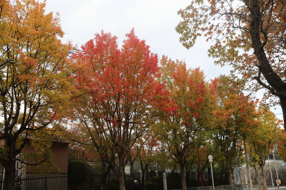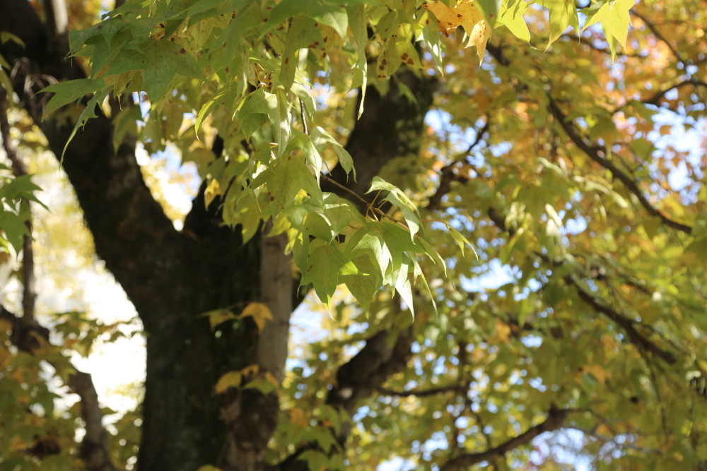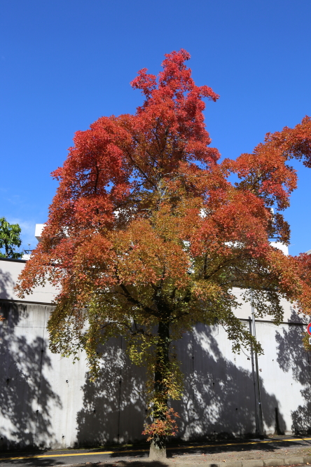 | 阪急北千里駅前を東西に走る幹線道路は三色彩道という美しい名前がついている。道の両側には、タイワンフウ(台湾楓)、アメリカフウ(アメリカ楓)、トウカエデ(唐楓)が植えられていて、秋には緑、黄色、紅に染まり、近隣から多くの人が紅葉狩りにやってくる。(フウは「楓」の字からきているが、「カエデ」の仲間ではない。球形花序の大きな実が地面に落ちていて、イロハモミジのような翼果ではない。) 見頃にはあと2週間ほどかかるだろう。 |