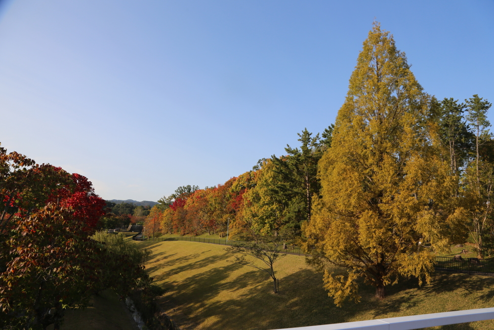 | ネムノキがある所の東側には青山公園がある。メタセコイヤいろいろな木々が植えられていて、今は色づいてこれまた美しい。 | |