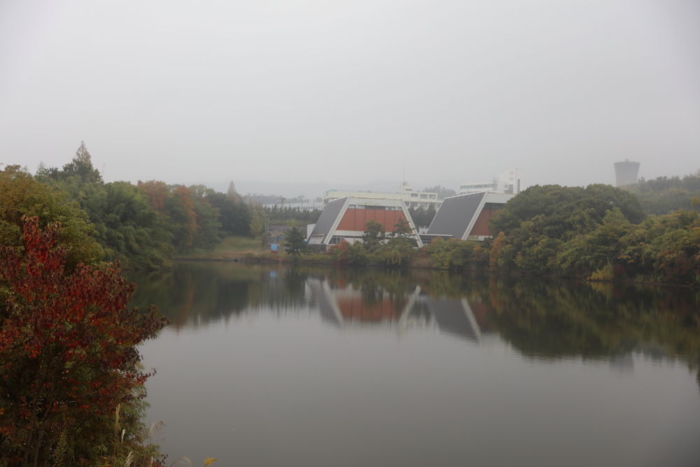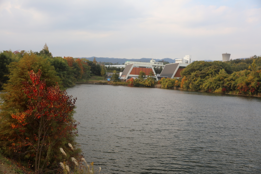 | 千里北公園内の蓮間池(はすまいけ)。カモ類などの水鳥が多数みられるはずだが、今日は見られない。正面に見えるのは北千里市民体育館。まるで北欧の湖畔の風景のよう。その奥に北千里高校の校舎が見える。今年6月までは、さらにその奥に、旧国立循環器病研究センターの威容を眺めることができた。 | |
