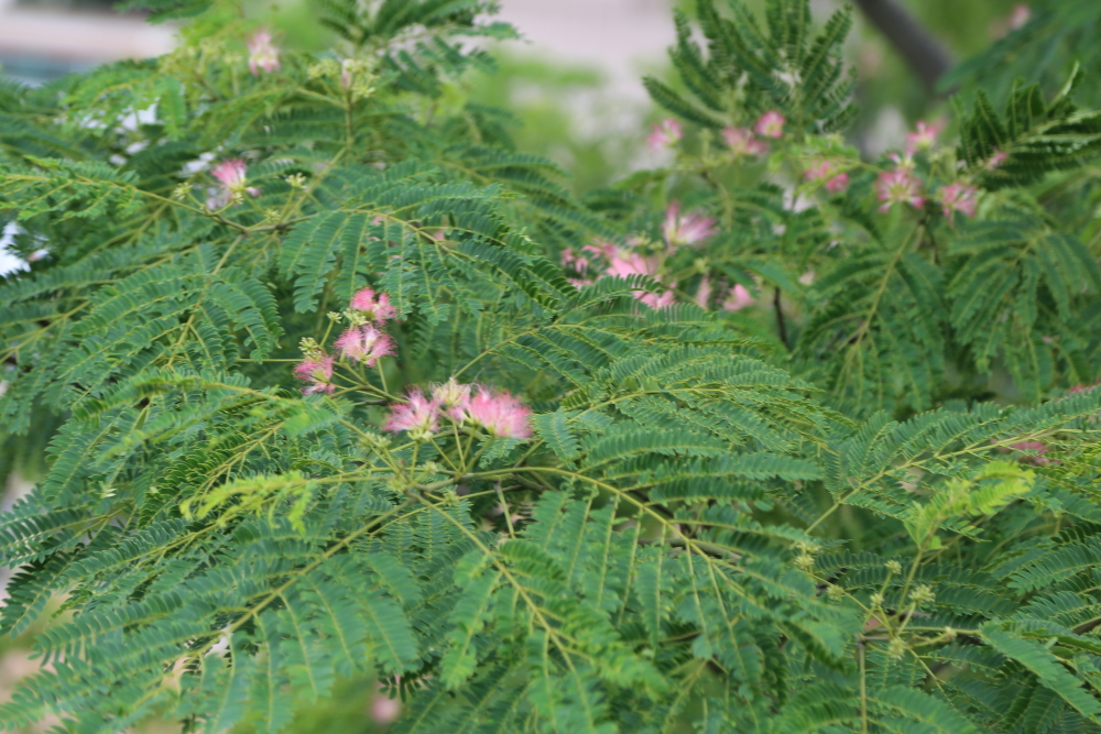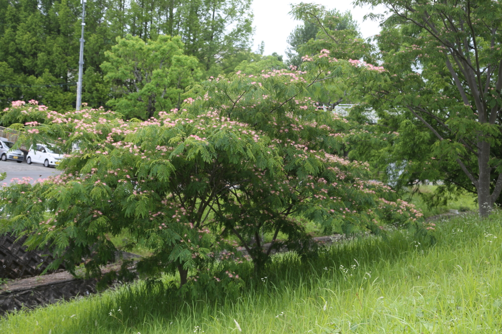 | 北千里駅前から北に用水路沿いに延びる道は合歓の木道言われる。その名前の由来のネムノキが花盛りだ。 |